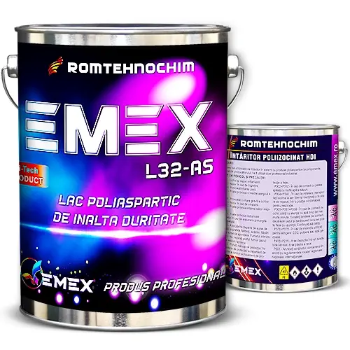 Lac Poliaspartic de Inalta Duritate “Emex L32-AS” - un sistem inovator, de inalta performanta, bicomponent, cu proprietati anti scratching, pe baza de esteri aspartici solvent-free, cu uscare si intarire foarte rapida, la aer.