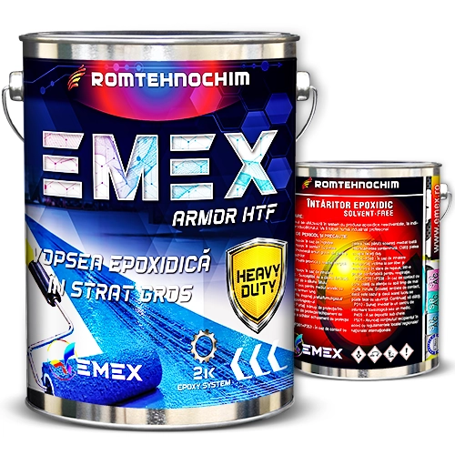 Vopseaua Epoxidică de Pardoseală în Strat Gros "Emex Armor HTF" este un sistem epoxidic bicomponent profesional, destinat protecției pardoselilor din beton expuse la trafic intens, solicitări mecanice ridicate și acțiunea agenților chimici. Sistemul combină formularea specifică pardoselilor epoxidice autonivelante, pe bază de rășini epoxidice fără solvent și conținut ridicat de solide, cu aplicarea simplă la trafalet. Această tehnologie permite realizarea unor straturi dure, cu o grosime de circa 500 µm, cu rezistență mecanică ridicată și performanțe apropiate sistemelor autonivelante, fără utilizarea echipamentelor sau instrumentelor speciale de turnare.